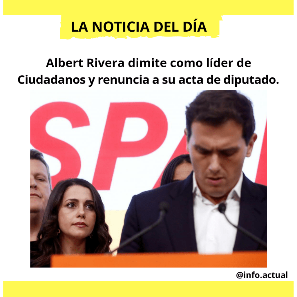 Tras las elecciones generales y con una bajada con respecto a los comicios del 28-A de 47 escaños, Albert Rivera dimite como presidente de Ciudadanos y renuncia a su acta de diputado.